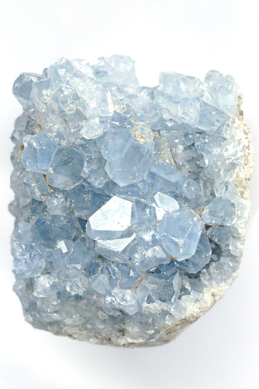 - Avoid water: Never cleanse with water due to celestine's slight solubility—can damage surface and structure